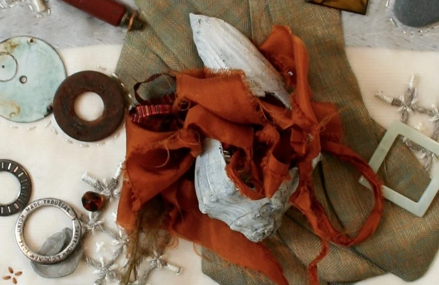 Although I describe my work as fiber art, amidst the textiles in my studio are collections of shells, buttons, hardware, beads, lace, feathers, and numerous miscellaneous items that refuse to be neatly categorized. This is my treasure trove, discovered in antique shops and hardware stores, on beaches and on-line, in friends' and family's caches, in fabric stores from designer to discount. I "hunt and gather." Some objects resonate with my sense of delight. Some, worn and damaged, are chosen for the story they tell. Some simply please my eye. All invite touch. My fingertips want to feel their hues, surfaces, and patterns.
